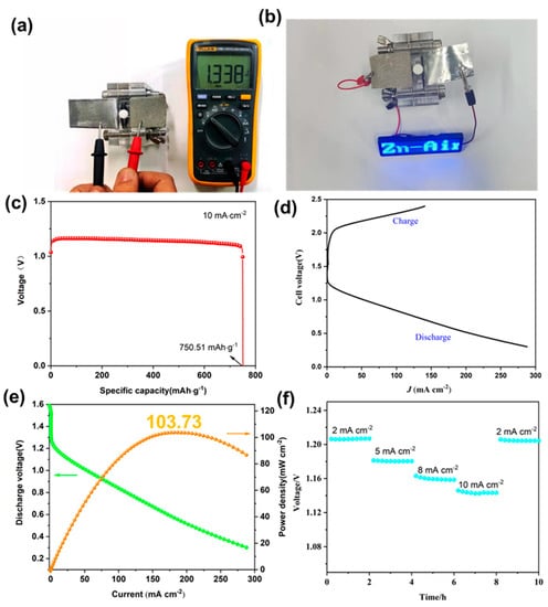 To evaluate the practical application of TAPP-Co-COF as an air-cathode catalyst, a Zn–air battery was assembled. The battery consisted of a Zn-foil anode and an air cathode loaded with catalysts on carbon paper. The TAPP-Co-COF electrode exhibited an open circuit voltage (OCV) of 1.338 V (Figure 5a), and the Zn–air batteries assembled using TAPP-Co-COF successfully powered light-emitting diodes (LEDs) (Figure 5b). The specific capacity of the TAPP-Co-COF electrode was calculated to be 750.51 mA h g−1Zn (Figure 5c). Long-term discharge curves at 10 mA cm−2, until the battery stopped functioning with Zn foil being completely consumed, were also obtained (Figure 5d). The power density of TAPP-Co-COF reached a maximum of 103.73 mW cm−2 when the current density was 182 mA cm−2 (Figure 5e). Additionally, the discharge curves of the assembled Zn–air battery at current densities of 2.0, 5.0, 8.0, and 10 mA cm−2 were investigated, and TAPP-Co-COF consistently maintained a higher discharge voltage (Figure 5f), indicating its promising application in Zn–air batteries. These results demonstrate the potential of TAPP-Co-COF as an efficient air-cathode catalyst for practical applications in Zn–air batteries.