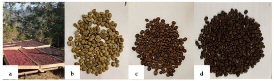 Processed cherries and beans of C. arabica (a) Drying of cherries of different varieties (GCM); (b) Mixture of green beans of different varieties; (c) Medium-roasted coffee beans (MRC); (d) Dark-roasted coffee beans (DRC).