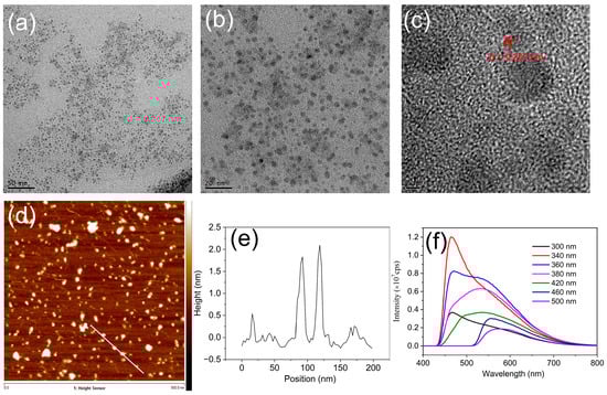 Characterizations of GQDs prepared by electrolysis of graphite electrodes. (a,b) TEM and (c) HRTEM of GQDs with a scale bar of 50 nm, 20 nm, and 2 nm, respectively; (d) AFM of GQDs; (e) The height of selected GQDs in (d); (f) PL emission spectra of GQDs aqueous dispersion at different excitation wavelengths (300 nm to 500 nm).