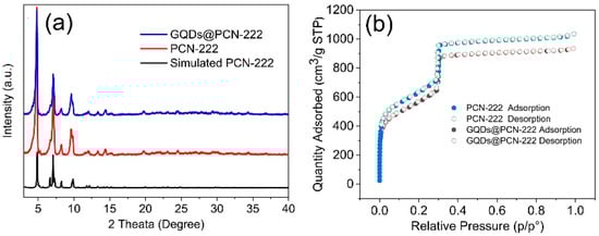 Structural characterization of PCN-222 and GQDs@PCN-222. (a) PXRD patterns of simulated PCN-222, PCN-222, and GQDs@PCN-222; (b) N2 sorption isotherms of PCN-222, and GQDs@PCN-222.