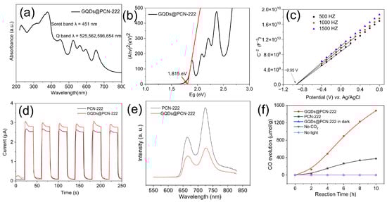 Photocatalytic performance and the photocatalytic mechanism-related characterizations. (a) Solid UV-vis diffuse reflectance spectrum of GQDs@PCN-222; (b) Tauc plot of GQDs@PCN-222; (c) Mott-Schottky plots of GQDs@PCN-222 with a frequency of 500, 1000, and 1500 HZ; (d) Photocurrent and (e) PL emission with excitation wavelength at 365 nm of PCN-222 and GQDs@PCN-222; (f) Photocatalytic CO2 reduction by photocatalysts.