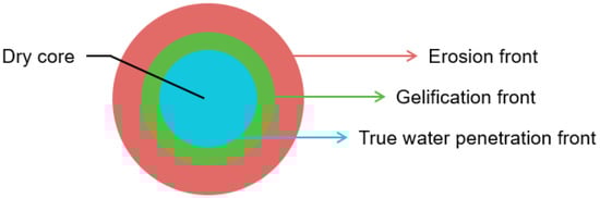 There are several mechanisms through which controlled drug release can be achieved. One of the most common controlled release systems in the case of oral dosage forms is a monolithic matrix system in which the drug is dispersed in a polymeric matrix. Release of the drug may be governed by diffusion, swelling and/or erosion of the matrix as a result of water penetration, depending on the design of the dosage form [20]. Furthermore, drug release from the dosage form may be chemically controlled, i.e., exposure to specific environmental conditions causes erosion of the dosage form and subsequent drug release [21,22]. Dissolution of swellable monolithic matrix systems has been studied through various imaging methods, including visible photography, fluorescence imaging, ATR- and transmission-FTIR imaging, scanning electron microscopy and magnetic resonance imaging [23]. Figure 1 presents the dissolution of a swellable monolithic matrix system as studied by ATR-FTIR spectroscopic imaging [24]. Here, dissolution is characterised by three concentric fronts. The innermost front is attributed to the true water penetration front, where water enters the porous tablet but minimal gel formation takes place. The second front is attributed to gelification, i.e., the transition from a glassy polymer to a gel-layer. Lastly, the outermost front can be described as the erosion or dissolution front, where the water content is high and the matrix disappears [24,25]. The behaviour of the different fronts during tablet dissolution and particularly the thickness of the gel layer are indicative of the drug release kinetics and are therefore worth studying [26].