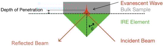 The depth of penetration is defined as the distance from the IRE surface at which the electric field has decreased to e−1 of its value at the surface and can be calculated using Equation (1). Here, is the wavelength of the IR radiation, is the angle of incidence and and are the refractive indices of the sample and crystal, respectively [38].