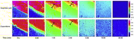 ATR-FTIR images showing the dissolution of ibuprofen acid and copovidone polymer extrudate. Chemical images were obtained by integrating over the range 1523–1501 cm−1 for ibuprofen acid and 1044–1013 cm−1 for copovidone. Reprinted with permission [79].