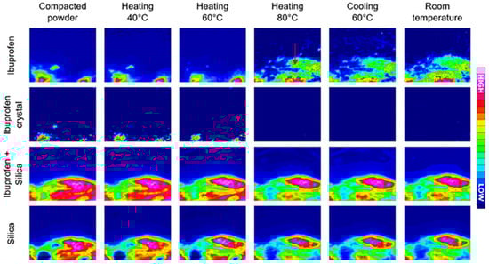In a paper by Lizonova et al., the loading process of ibuprofen into mesoporous silica microparticles via hot-melt loading (HML) was explored using ATR-FTIR spectroscopic imaging. The resulting HML samples were compared to a physical mixture (PM) of ibuprofen crystals and silica particles in the same ratio, and their drug release was studied in both powder and tablet form. In addition to FTIR spectroscopic imaging, differential scanning calorimetry and scanning electron microscopy were used to characterise the bulk properties of the HML silica particles and PM sample [80]. The hot-melt loading process was successfully followed by ATR-FTIR imaging (Figure 6), as the crystalline and amorphous ibuprofen could be clearly distinguished based on the absorption peak at 2922 cm−1, corresponding to CH2 vibrations in crystalline ibuprofen. After reaching the melting point of ibuprofen, the molten drug is redistributed to other areas within the silica microparticles through capillary forces of the silica pores. Furthermore, the chemical images demonstrate that once the drug is molten, the crystalline form of ibuprofen is no longer present. Additionally, after the sample is cooled down to room temperature, crystalline ibuprofen does not show up in the chemical images, demonstrating that the amorphous form of ibuprofen is stable in the silica particles and that the hot-melt loading method was effective [80]. This was followed by a dissolution experiment, which revealed the rapid release of ibuprofen in amorphous state. However, local super-saturation promoted the formation of ibuprofen crystals, both at the surface of the tablet as well as within cavities. When comparing the chemical images of the HML tablet to the PM tablet during dissolution, it can be concluded that drug release is much slower for the ibuprofen crystals in the PM tablet than for the amorphous ibuprofen in the HML tablet. In addition, it was observed that dissolved ibuprofen from the crystals in the PM tablet interacted with the surface of silica particles, leading to the adsorption of ibuprofen molecules on the silica surface [80].
