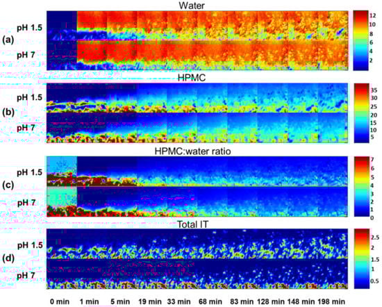 To understand the impact of pH and ionic strength on drug release rate from a hydrophilic matrix, ATR-FTIR imaging was employed to monitor tablets containing itraconazole (IT) and excipient hydroxypropyl methylcellulose (HPMC) [83]. ATR-FTIR imaging showed that gel layer formation and swelling were not influenced by pH but heavily depended on ionic strength of the hydrating medium in placebo tablets which only contained HPMC. Following this, HPMC tablets containing itraconazole were studied using a hydration medium of low ionic strength, while only varying the pH value, i.e., pH 1.5 and pH 7. The ATR-FTIR images of water, HPMC and HPMC/water are shown in Figure 7. Differences in swelling could be observed between the low and neutral pH conditions, as well as differences in IT distribution. At neutral pH, the drug is insoluble and does not easily dissolve or diffuse through the hydrated polymer matrix. IT therefore mainly resides in the core of the tablet, while the HPMC matrix swells, carrying some IT particles with it. At low pH, however, IT is much more mobile and is able to move with the diffusion front. Based on these observations, it could be concluded that polymer swelling is significantly different for the two pH values when IT is present in the tablet. To obtain a better understanding of the drug translocation phenomena taking place during swelling and expansion of the polymer matrix, IT particles in the FTIR images were characterized and tracked during their outward movement. This analysis confirmed that at lower pH, IT particles were more mobile and moved larger distances relative to the interface. This was explained by the higher drug solubility at low pH, which results in IT being able to dissolve out of the HPMC matrix, changing the porosity and expansion properties of the matrix during hydration. All in all, this study demonstrated the use of ATR-FTIR spectroscopic imaging for the analysis of drug release from hydrophilic matrices, specifically for poorly soluble drugs under different pH environments [83].