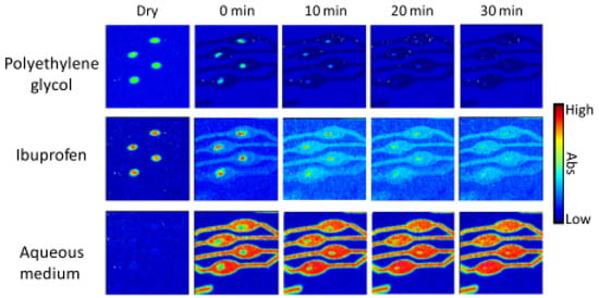 ATR-FTIR images showing the distribution of PEG, ibuprofen and the aqueous medium during the dissolution experiment of four ibuprofen/PEG (1:3 w/w) tablets. Image size: 11.5 × 8 mm2. Reprinted with permission [84].