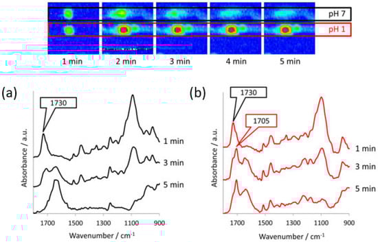 Top: ATR-FTIR images of the dissolution of two ibuprofen/PEG (1:3 w/w) tablets in separate channels with different pH medium, i.e., pH 7 and pH 1. Image size: 7.75 × 6 mm2. Bottom: ATR-FTIR spectra extracted from (a) the pH 7 chemical images and (b) the pH 1 chemical images. The peaks characteristic of crystalline ibuprofen (1705 cm−1) and molecularly dispersed ibuprofen (1730 cm−1) are indicated. Reprinted with permission [84].