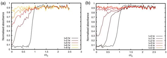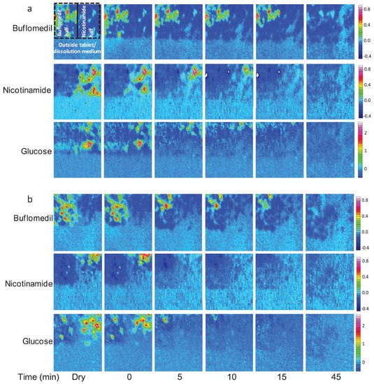 ATR-FTIR images showing the dissolution of (a) tablet A containing a low loading of glucose on the nicotinamide side, i.e., 10 wt% glucose, and (b) tablet B containing high loading of glucose on the nicotinamide side, i.e., 40 wt% glucose. Image size: 690 × 610 µm2. Adapted with permission [64].