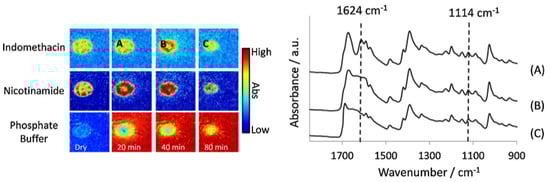 Left: ATR-FTIR images of the dissolution of a compacted tablet containing indomethacin and nicotinamide. The distribution of indomethacin, nicotinamide and phosphate buffer are shown over time; the letters A, B and C indicate the locations from which spectra at different time points were extracted. Image size: 7.75 × 6.05 mm2. Right: Extracted spectra from locations A, B and C. The peaks at 1624 cm−1 and 1114 cm−1 are representative of the co-complex of the two drugs, which was present at all three time points. Reprinted with permission [89].