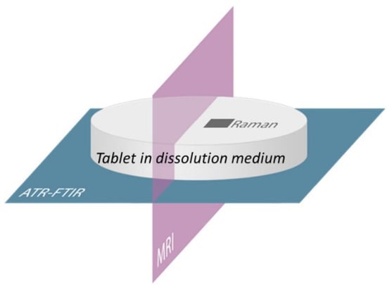 Attenuated total reflection-Fourier transform infrared (ATR-FTIR) spectroscopic imaging is a powerful chemical imaging technique which is used to study a variety of materials and processes. It enables label-free and non-destructive characterisation of a broad range of samples and can provide insight into the distribution of components as well as intermolecular interactions in the studied sample. The capabilities of so-called “chemical photography” for drug dissolution studies were demonstrated about 20 years ago, when the crystallisation of ibuprofen during dissolution was spectroscopically imaged for the first time in the authors’ laboratory using macro-ATR FTIR spectroscopic imaging [1]. Further developments in the field of vibrational spectroscopy and spectroscopic imaging have led to the extensive use of advanced spectroscopic techniques in the pharmaceutical industry, particularly in research on the dissolution and drug release of pharmaceutical formulations [2,3]. A large amount of useful information can be collected rapidly and easily in a single measurement, as every FTIR image, besides providing spatial information, contains the spectral data of each individual component in the sample. FTIR spectroscopic imaging therefore has a great advantage over other analytical tools when it comes to studying multi-component and dynamic systems, making it a suitable technique for studying tablet dissolution and drug release [4]. Because of its high chemical specificity and spatial resolution, it can be employed as a stand-alone technique with the capability to show “a full picture” of the sample under study [5]. However, it can be complemented by other chemical imaging techniques such as Raman spectroscopic mapping, magnetic resonance imaging (MRI) or ultraviolet (UV) imaging [6].
