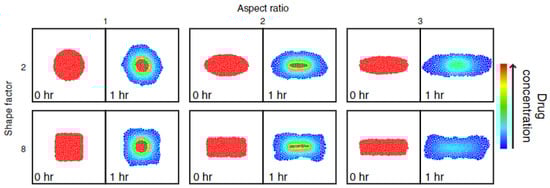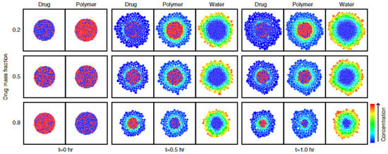 Kimber et al. applied the discrete element method (DEM), in which the dosage form is divided into units of discrete mass, so-called DEM particles, to develop a model for the dissolution behaviour and drug release from swelling tablets [94]. Dissolution behaviour and drug release were further investigated by performing parametric studies on some of the most important parameters for drug release, including the distribution of drug and polymer, the maximum swelling ratio and the diffusivity of the drug through polymer [93,94]. Figure 13 shows the concentration distribution of different components within a swelling tablet at different drug loadings resulting from the DEM-based model. In this case, drug and polymer were heterogeneously dispersed.