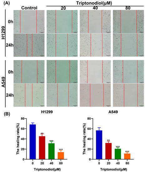 To observe the degree of migration inhibition on NSCLC by Triptonodiol, wound-healing assays were carried out. We chose three low-toxicity concentrations (20 μM, 40 μM and 80 μM) to study the anti-seeding effects of Triptonodiol. It was shown that the degree of wound healing of NSCLC was significantly reduced after Triptonodiol treatment. These results further confirmed the migration inhibitory effect of Triptonodiol on NSCLC in a dose-dependent manner (Figure 2A,B).