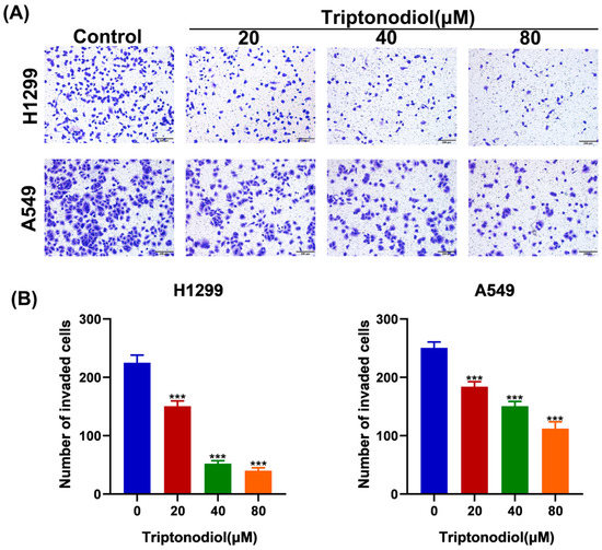 In living organisms, tumor cells need to lyse the extracellular matrix and invade surrounding tissues in order to detach from the primary focus, a prerequisite for distant metastasis [17]. To investigate whether Triptonodiol has an anti-invasion ability against NSCLC, we conducted Transwell assays. The results showed that Triptonodiol significantly reduced the ability of NSCLC to penetrate the Transwell filter membrane (Figure 3A,B). These results suggest that Triptonodiol can significantly reduce the invasion ability of NSCLC, which is related to the ability of cells to lyse the extracellular matrix.