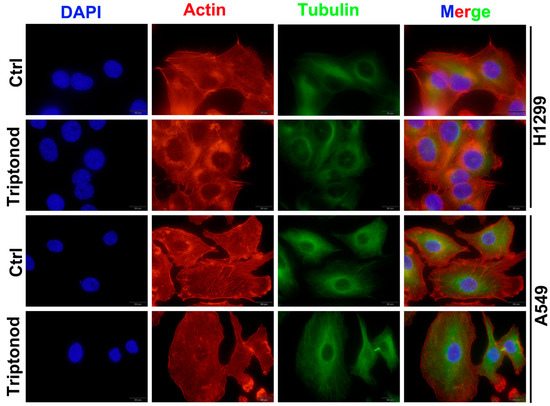 Triptonodiol inhibits cytoskeletal remodeling in NSCLC. Immunofluorescence staining of actin and tubulin after 24 h of Triptonodiol treatment at concentration of 80 μM. DAPI was used for nuclear staining. Scale bar, 20 μm.