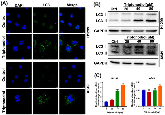 There is growing evidence that the drug modulation of cellular autophagy levels is an important cellular response in tumor therapy [18]. Therefore, we investigated whether autophagy levels in NSCLC were regulated by Triptonodiol. Treatment with Triptonodiol increased the number of autophagic vesicles inside the cells (Figure 5A). Immunofluorescence experiments showed that these autophagic vesicles surrounded the nucleus, which may have been a manifestation of complete autophagy [19]. Next, we examined the expression level of the LC3 protein by means of immunoblotting experiments. The results showed that treatment with Triptonodiol on NSCLC significantly increased the expression of the LC3-Ⅱ protein (Figure 5B,C), a marker of mature autophagic vesicles [20].
