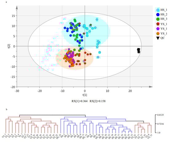 Analysis of the accumulation patterns of Morus alba L. and Morus nigra L. metabolites. (a) Principal component analysis (PCA) of metabolome in the 138 samples of Morus nigra L., Morus alba L. and QC. (b) Cluster dendrogram of metabolome.