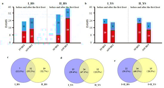 We performed further analysis and quantification of differentially accumulated metabolites (DAMS) in Morus alba L. and Morus nigra L. before and after two frost events (Tables S3 and S4). Our findings revealed that Morus alba L. exhibited 58 DAMS before and after two frosts, while Morus nigra L. had 51 differential metabolites (Figure 3a–d). The number of common DAMS in HS after the first and second frost events was 33 (55.2%), whereas in YS it was 24 (47.1%) (Figure 3c,d). Nevertheless, after exposure to frost conditions, the shared differential metabolites between the two varieties constituted about 50% of the total changed metabolites (Figure 3e), indicating substantial differences in compounds affected by frost in the two varieties.