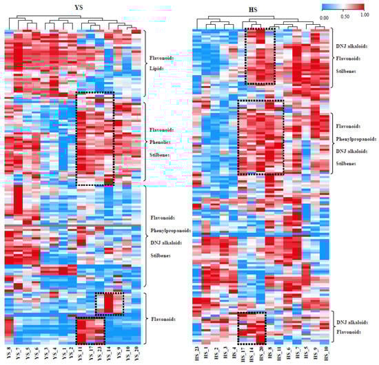 Interestingly, we found that the metabolic accumulation patterns of Morus nigra L. exhibited significant changes on the day of frost, as demonstrated by the significant differences in metabolite profiles between tissues collected in the morning and evening of the frosting day (YS_11, YS_13, YS_17, and YS_19) compared to those collected at other times. Additionally, we observed that the time of day at which the leaves were collected on the frosting day (morning: YS_11 and YS_17; noon: YS_12 and YS_18; and evening: YS_13 and YS_19) had effects on the metabolic accumulation pattern of Morus nigra L. (Figure 2b).