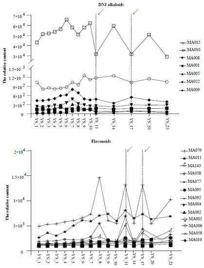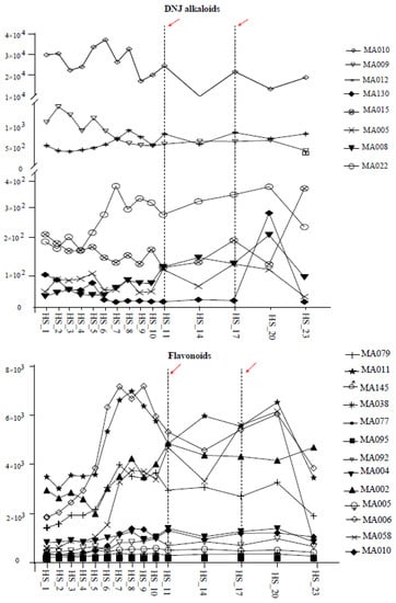 Accumulation patterns of DNJ alkaloids and flavonoids in Morus nigra L. after frost. The red arrows (dashed lines from left to right) indicate the first and second the frost from left to right respectively.