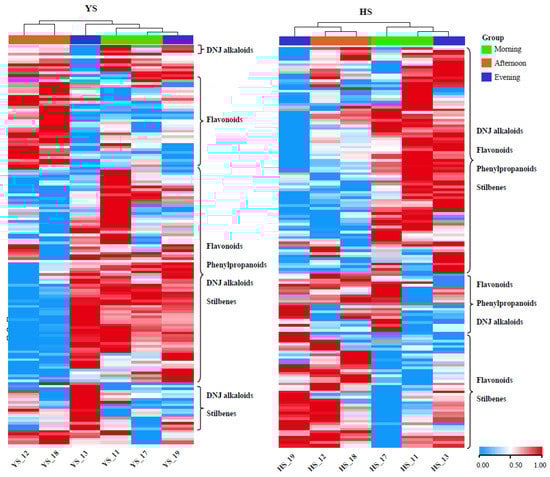 To further investigate the influence of circadian rhythm on the metabolite composition of mulberry leaves, we collected leaf tissues from Morus nigra L. and Morus alba L. at three different time points: morning (9:00 a.m.), afternoon (4:00 p.m.), and evening (11:00 p.m.). The extracted metabolites were analyzed during the two frost treatments. As illustrated in Figure 7, the overall accumulation patterns for both Morus nigra L. and Morus alba L. were similar. Notably, significant differences in metabolite accumulation were observed between leaves collected in the afternoon versus those collected in the morning or at night. In Morus nigra L., with the exception of a small number of leaves collected at noon exhibiting high flavonoid content, most other substances, including DNJ alkaloids, flavonoids, phenylpropanoids, and stilbenes, were significantly lower than those in the morning and evening. Similar trends were found for Morus alba L. (Figure 7).