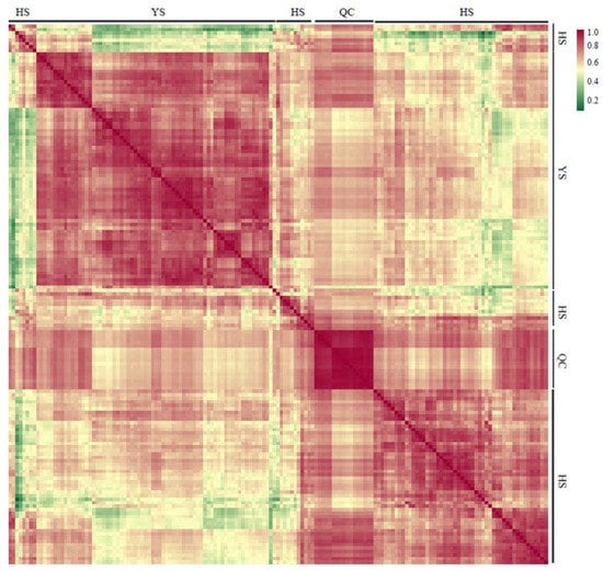 In MSE mode, the low-energy scan was not activated, and the energy for the high-energy scan was set to 15 eV–40 eV. To ensure quality, accuracy, and reproducibility, sodium formate was used as a calibration solution. Additionally, real-time mass number correction was performed using leucine enkephalin (LE) (m/z 556.2771 in positive ion mode and m/z 554.2615 in negative ion mode). A total of 17 quality control (QC) samples were prepared (Table S2). The QC samples were formulated by uniformly mixing the extractive solutions of all samples to assess whether the experimental conditions, such as instruments, were stable throughout the experiment. Correlations between the offline data of the metabolic group samples were analyzed to determine the biological repeat effect of the samples in the group. The higher the correlation coefficient, the stronger the biological repeat in the group and the more reliable the data. Pearson’s correlation coefficient (r) was used to evaluate the correlation index of biological repeat samples. Statistical results indicated that all 17 QC groups exhibited strong correlation with r values close to 1, confirming robust sample consistency within this experiment (Figure 8).
