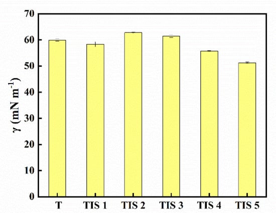 The surface tensions of the saturated aqueous solutions of terbinafine and its ionic salts (TISs) at 25 °C are presented in Figure 2. The surface tension of TIS 2 was found to be the highest, with a value of 62.78 mN·m−1, followed by TIS 3 (61.48 mN·m−1), terbinafine (T: 59.92 mN·m−1), TIS 1 (58.33 mN·m−1), TIS 4 (55.68 mN·m−1), and TIS 5 (51.26 mN·m−1). The results indicated that the anions in TIS 2 and TIS 3 did not effectively reduce the surface tension. In general, the solutions with a lower surface tension exhibited longer retention times and an increased coverage of the pesticide on the plant, thereby enhancing its bioactivity [12,25]. The surface tension of the TIS 5 solution was the smallest among the TISs and was lower than that of the parent terbinafine solution. Therefore, TIS 5 was expected to exhibit a superior biological activity among the TISs.