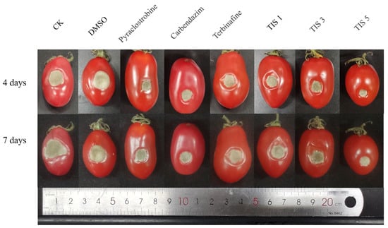 Small holes in the tomatoes were made with an inoculating needle and a 5 mm diameter mycelial plug was placed on the skin of each tomato. The inoculated tomatoes were laid on a plate with sterilized gauze and incubated at 25 °C under 100% relative humidity for 24 h. Then, the tomatoes were treated with the selected compounds—terbinafine, TIS 1, TIS 3, and TIS 5—that had good activity in the in vitro antifungal assays. Carbendazim and pyraclofosfom were selected as positive controls and 0.4% DMSO aqueous solution was used as a blank control. Each tomato was soaked in approximately 20 ml of a 20 mg/L solution of the compound for 2 min, with eight replicates for each sample.