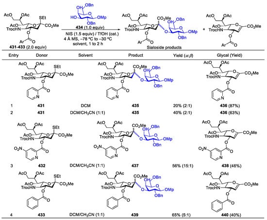 - Asressu, K.H.; Chang, C.W.; Lam, S.; Wang, C.C. Donor-Reactivity-Controlled Sialylation Reactions. Eur. J. Org. Chem. 2021, 2021, 4525–4530. [Google Scholar] [CrossRef]