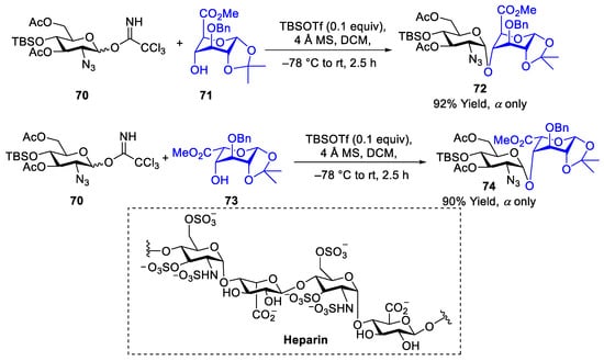- Orgueira, H.A.; Bartolozzi, A.; Schell, P.; Seeberger, P.H. Conformational Locking of the Glycosyl Acceptor for Stereocontrol in the Key Step in the Synthesis of Heparin. Angew. Chem. Int. Ed. 2002, 41, 2128–2131. [Google Scholar] [CrossRef]