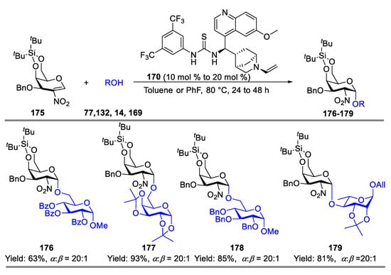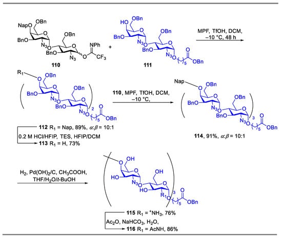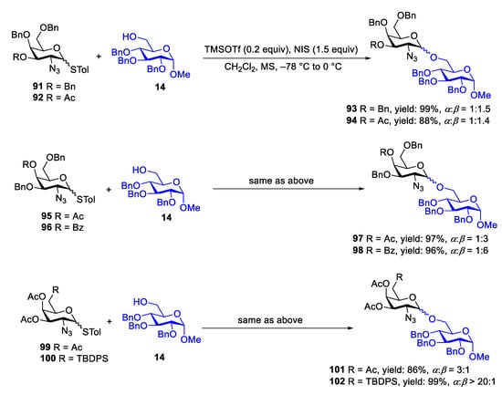 - Koto, S.; Asami, K.; Hirooka, M.; Nagura, K.; Takizawa, M.; Yamamoto, S.; Okamoto, N.; Sato, M.; Tajima, H.; Yoshida, T.; et al. Glycosylation using 2-Azido-3,4,6-Tri-O-Benzyl-2-Deoxy-D-Glucose, -Galactose, and -Mannose with the Aid of p-Nitrobenzenesulfonyl Chloride Silver Trifluoromethanesulfonate Triethylamine System. Bull. Chem. Soc. Jpn. 1999, 72, 765–777. [Google Scholar] [CrossRef]