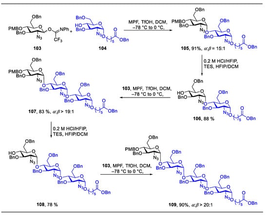- Codée, J.D.C.; Stubba, B.; Schiattarella, M.; Overkleeft, H.S.; van Boeckel, C.A.A.; van Boom, J.H.; van der Marel, G.A. A Modular Strategy toward the Synthesis of Heparin-like Oligosaccharides Using Monomeric Building Blocks in a Sequential Glycosylation Strategy. J. Am. Chem. Soc. 2005, 127, 3767–3773. [Google Scholar] [CrossRef]