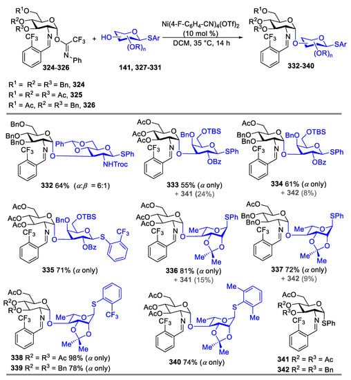 - Yu, F.; Nguyen, H.M. Studies on the Selectivity Between Nickel-Catalyzed 1,2-cis-2-Amin Glycosylation of Hydroxyl Groups of Thioglycoside Acceptors with C(2)-Substituted Benzylidene N-Phenyl Trifluoroacetimidates and Intermolecular Aglycon Transfer of the Sulfide Group. J. Org. Chem. 2012, 77, 7330–7343. [Google Scholar] [CrossRef] [PubMed]