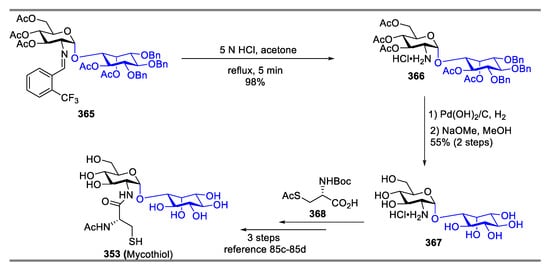 - Ajayi, K.; Thakur, V.V.; Lapo, R.C.; Knapp, S. Intramolecular α-glucosaminidation: Synthesis of Mycothiol. Org. Lett. 2010, 12, 2630–2633. [Google Scholar]