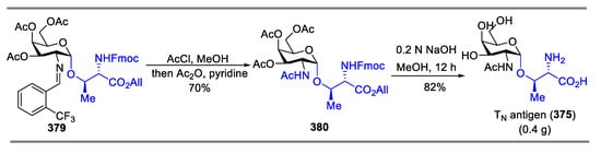 - Yu, F.; McConnell, M.S.; Nguyen, H.M. Scalable Synthesis of Fmoc-Protected GalNAc-Threonine Amino Acid and TN Antigen via Nickel Catalysis. Org. Lett. 2015, 17, 2018–2021. [Google Scholar] [CrossRef] [PubMed]