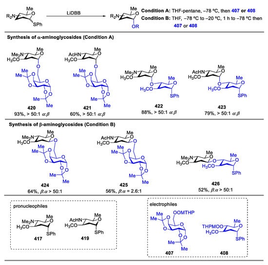 - Hoang, K.M.; Lees, N.R.; Herzon, S.B. General Method for the Synthesis of α- or β-Deoxyaminoglycoside Bearing Basic Nitrogen. J. Am. Chem. Soc. 2021, 143, 2777–2783. [Google Scholar] [CrossRef] [PubMed]