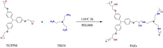 Tris(4-hydroxyphenyl)methane triglycidyl ether (TGTPM) was purchased from Sigma Aldrich Chemicals. N,N-bis(2-aminoethyl)ethane-1,2-diamine (TREN, 96%), polyethylene glycol (PEG, Mn avg = 400), and palladium chloride (Pd approximately 59–60%) were supplied by Aladdin Reagents Co., Ltd. (Shanghai, China). Sodium borohydride (NaBH4, 98%) was purchased from Kermel Reagents Co., Ltd. (Tianjin, China). The 4-nitrophenol (4-NP, 99%) was purchased from Energy Chemical Co., Ltd. (Shanghai, China). Sodium hydroxide (NaOH, AR) was purchased from Sinopharm Chemical Reagents Co., Ltd. (Shanghai, China). Hydrochloric acid (HCl, AR, approximately 36–38%) was purchased from Chuandong Chemical Co., Ltd. (Chongqing, China).