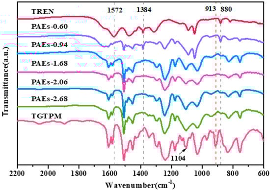 FT-IR spectra of TREN, TGTPM, and PAEs (PAEs-X, X = 0.60, 0.94, 1.68, 2.06, 2.68).