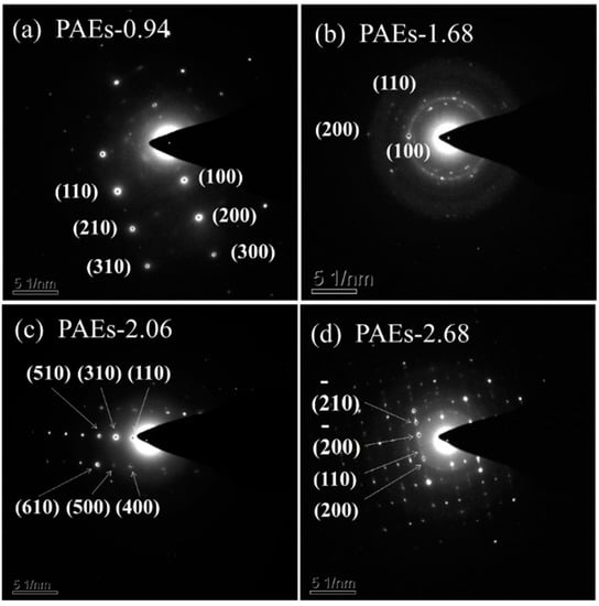 Electron diffraction patterns of PAEs (PAEs-X, X = (a) 0.94, (b) 1.68, (c) 2.06, (d) 2.68).