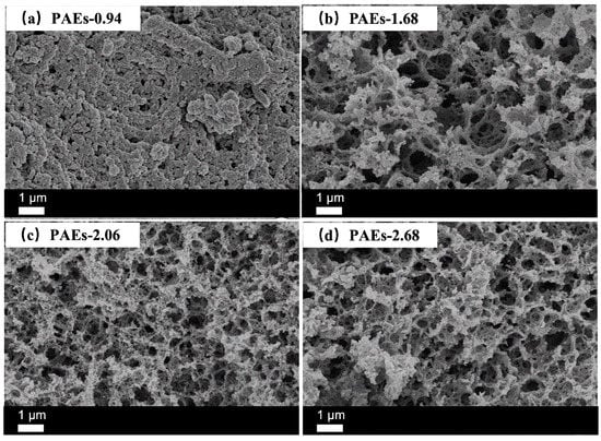 SEM images of PAEs (PAEs-X, X = 0.94 (a), 1.68 (b), 2.06 (c), 2.68 (d)).