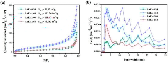 (a) N2 adsorption isotherms of PAEs (PAEs-X, X = 0.94, 1.68, 2.06, 2.68) at 77 K; (b) pore size distribution histogram of PAEs (PAEs-X, X = 0.94, 1.68, 2.06, 2.68) calculated from DFT fitting of the adsorption branch of the N2 adsorption isotherm at 77 K.