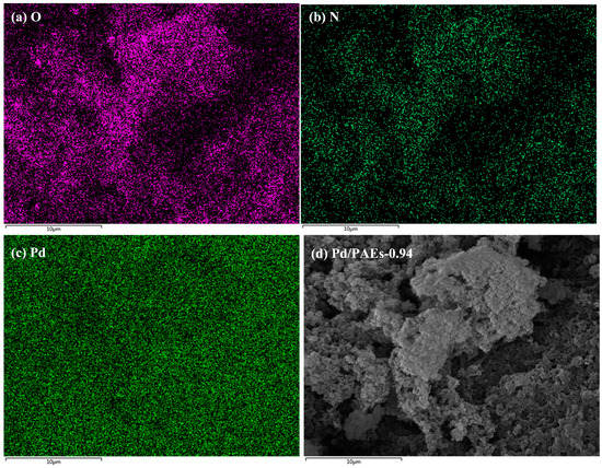The porous structure and imino groups present on the surface of the material make it suitable for use as a catalyst carrier, particularly when immobilized with noble metal nanoparticles [36]. The PAEs developed in this study contain numerous electron-rich groups, including imino and hydroxyl groups, which have an affinity for metal ions [37]. The elemental analysis (EA) of sample PAEs-0.94 revealed an actual nitrogen content of approximately 4.3%, which is slightly lower than the theoretical content of 5.1%. Energy-dispersive X-ray spectroscopy (EDX, Zeiss, Jena, Germany) was utilized to confirm the element distribution on the porous polymer material after the immobilization of Pd. EDX mapping revealed an even distribution of oxygen and nitrogen elements in the polymer, as seen in Figure 10a,b. Furthermore, Pd nanoparticles were loaded onto the porous polymer via impregnation–reduction, and EDX mapping confirmed the presence of Pd element on the polymer (Figure 10c). The impregnation–reduction method enables in situ reduction of metal ions, which are then converted into nanoparticles that are affixed to the material surface. This prevents aggregation of metal catalysts and improves their catalytic capability. Transmission electron microscopy (TEM) was employed to verify the presence of Pd nanoparticles on the porous material. As depicted in Figure 11c, the Pd nanoparticles were observed to be loaded onto the polymer surface in a monodisperse manner, with an average particle size of 6.9 nm. According to inductively coupled plasma (ICP) data, the Pd content in the composite was 5.9 wt%.