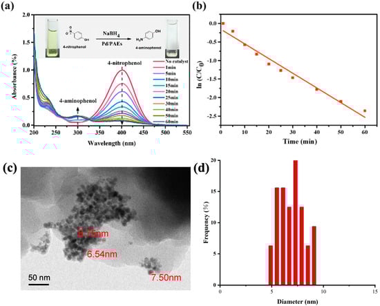 (a) UV–Vis spectra of 4-nitrophenol reduction with Pd/PAEs-0.94 hybrid nanocomposites as catalyst; (b) quasi-first-order reaction kinetic equation for the degradation of 4-nitrophenol by sample Pd/PAEs-0.94; (c) TEM image and (d) the corresponding size distribution of the Pd nanoparticles on PAEs.