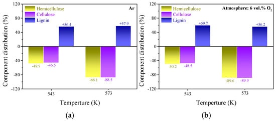 According to the results in Table 1, the relationship between upgradation condition and biomass elemental distribution was identified, and the specific results are illustrated in Figure 2a. The chemical formulae of hemicellulose, cellulose and lignin are (C5H8O4)m, (C6H10O5)m and [C9H10O3 (OCH3)0.9–1.7]m, respectively, so the O/C atomic ratio values for hemicellulose, cellulose and lignin are approximately 0.82, 0.83 and 0.53, respectively [13,19]. The decomposition of hemicellulose accelerates the cleavage of glycosidic bonds and the desorption of O-acetyl groups, as well as methylene on side chains, accompanied by the emission of oxygen-containing gaseous species [29]. The variations in the elemental distribution for each torrefied sample derived from different upgradation processes could be attributed to the almost complete removal of hemicellulose, along with massive removal of cellulose and slight oxidation of lignin in wheat straw particles. Additionally, Silva et al. [26] and Wang et al. [27] showed that an oxidizing atmosphere was beneficial to promote the release of light volatile materials during the thermal conversion process of carbonaceous materials. This is consistent with the phenomena observed during this research; the devolatilization tends to be strengthened during oxidative torrefaction processes. Therefore, the ash content and fixed carbon content are more likely to increase at the expense of volatile content.