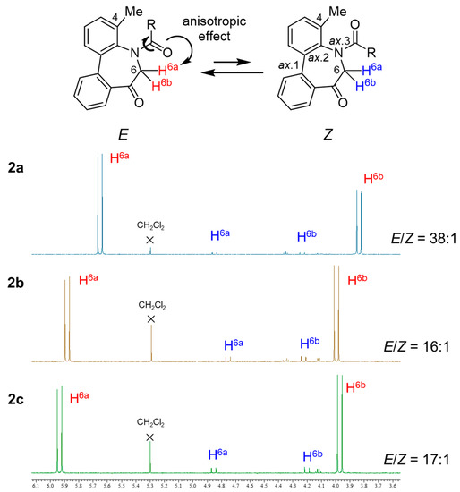 N-Acyl-5H-dibenzo[b,d]azepin-7(6H)-ones (2a–c) have axial chirality based on the Ar–Ar (sp2–sp2) axis (axis 1) and the Ar–NC(=O) (sp2–sp2) axis (axis 2), as well as the E/Z-amide diastereomers around the N-(C=O) bond (axis 3), as shown in Figure 1. Considering these stereochemical features, dibenzoazepinones might exist as complex stereoisomers. However, our previous studies revealed that the dibenzoazepinone nuclei form stable relative configurations, that is, a pair of enantiomers [(a1R, a2R), (a1S, a2S)], owing to the concerted rotation of axes 1 and 2 [11,12,13,29]. The relative configuration [(a1R, a2R), (a1S, a2S)] of N-acyl-5H-dibenzo[b,d]azepin-7(6H)-ones was also confirmed via density functional theory (DFT) calculations [29]. Additionally, the stereochemical properties of N-acyl-5H-dibenzo[b,d]azepin-7(6H)-ones (2a–c) in a solution were examined using 1H NMR spectroscopy. Compounds 2a–c existed as an equilibrium mixture of diastereomers in the solution (CDCl3) in ratios of 38:1, 16:1, and 17:1 (Figure 1). In each spectrum, one of the two diastereotopic H-6 protons of a major diastereomer resonates at approximately 5.66 ppm (2a), 5.88 ppm (2b), 5.94 ppm (2c), each 1.82 ppm, 1.88 ppm, and 1.97 ppm downfield from its partner, respectively. A similar downfield shift was observed in our previous study [29] and was ascribed to the anisotropic effect of the carbonyl group. Thus, we considered that 2a–c exist in E-amide in preference to Z-amide. The exocyclic amide bond (axis 3) did not move in concert with the two endocyclic axes (axes 1 and 2).