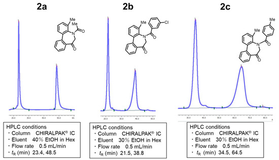 Owing to the 4-methyl substituent, the conformational change in 2a–c was fully frozen, and we separated into stable enantiomers [(a1R, a2R), (a1S, a2S)] using chiral HPLC at room temperature (Figure 2). Therefore, each enantiomer of compounds 2a–c was isolated at room temperature in an enantiomerically pure form.