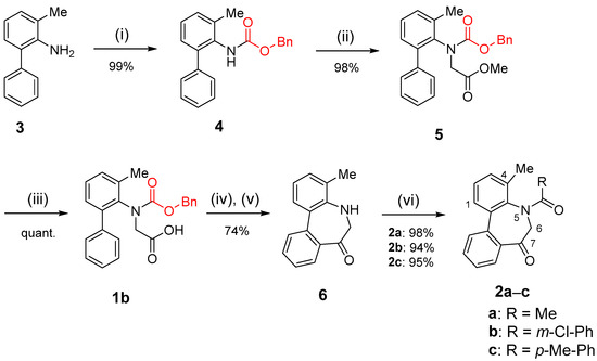 In contrast, the intramolecular Friedel–Crafts acylation of N-benzyloxycarbonyl (Cbz) compound 1b (Scheme 2) proceeded efficiently to yield the corresponding 5H-dibenzo[b,d]azepin-7(6H)-one 6. The Cbz group was removed during the cyclization reaction, and the obtained compound 6 was suitable for the following N-acylation reaction. As expected, the N-acylation of 6 under basic conditions afforded N-acyl-5H-dibenzo[b,d]azepin-7(6H)-ones 2a–c in good yields. In our previous study [29], 4-unsubstituted N-Acetyl-5H-dibenzo[b,d]azepin-7(6H)-one was prepared using 4-unsubstituted N-trifluoroacetyl-5H-dibenzo[b,d]azepin-7(6H)-one via the following two steps: deprotection of the trifluoroacetyl group and N-acetylation. However, synthesizing N-Acetyl-4-methyl-5,6-dihydro-7H-dibenzo[b,d]azepin-7-one in a similar manner was deemed impossible. We discovered that the deprotection of the trifluoroacetyl group from N-trifluoroacetyl-4-methyl-5,6-dihydro-7H-dibenzo[b,d]azepin-7-one could not proceed. Thus, an alternative method for synthesizing various N-acyl-5H-dibenzo[b,d]azepin-7(6H)-one derivatives was developed to proceed through the intramolecular Friedel–Crafts acylation of compound 1b, leading to the formation of 5H-dibenzo[b,d]azepin-7(6H)-one 6. 1H, 13C NMR spectra of 1b, 2a, 2b, 2c, 4, 5, and 6 are available in Supporting Information.