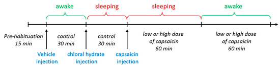 Seven days after surgery, each rat was gently restrained, and an infusion cannula (RWD Life Science, Shenzhen, China) was inserted into the lateral ventricle through the guide cannula to a depth of 3.8 mm below the surface of the skull. A vehicle or capsaicin solution with a volume of 2 μL was infused into the lateral ventricle in a 2 min period followed by an additional 1 min to allow diffusion before the injection needle was removed. The socket on the rat brain was connected to a CerePlex µ headstage of the EEG recording system through flexible recording cables on the day of EEG recording (Figure 1A, right). EEGs were recorded using a CerePlexTM Direct system (Blackrock microsystems, Salt Lake City, UT, USA; sampling rate, 1 kb/s; bandpass, 0–250 Hz) (Figure 1A, right). We recorded EEG patterns in both the sleeping and awake stage. For EEG recording in the sleep stage, we anaesthetized each rat using chloral hydrate (400 mg/kg, i.p.) and put it on a Styrofoam board at stable room temperature (25 °C) to prevent a steep decline in body temperature. For EEG recording in the awake stage, each rat was placed in a cage that permitted free movement. Baseline EEG recording was performed for 15 min before vehicle injection. Subsequently, an EEG was recorded continuously in the awake and sleeping stage, first after vehicle treatment for a 30 min period and then after capsaicin injection for a 1 h period. At the beginning of the experiment, a total of ten rats were initially included. However, during the adaptation period in the recording chamber, three out of ten rats removed the cannula themselves, rendering them unable to undergo EEG measurements. As a results, only seven rats remained for the experiment. Then, we injected the vehicle into the rats. After finishing baseline EEG recording in the awake and sleeping states, each for 30 min, the rats were divided into two groups: four rats for a low dose of capsaicin and three rats for a high dose of capsaicin. Subsequently, EEG recordings were conducted in the sleep and awake states for each rat for 1 h (Figure 2). As depicted in the scheme, the entire experimental procedure took over three hours to continuously record EEGs in different states. To analyze various sleep waves, we specifically selected data from the first 30 min of each stage. These data were then normalized to the control group of the respective state, allowing us to obtain a relative percentage of each wave type. Additionally, it should be highlighted that the hypnotic effects of chloral hydrate can be controlled by adjusting the drug administration interval. During the EEG recording period, we also measured the animal’s body temperature every 2 min. Digitized data were transmitted to a computer and analyzed with NeuroExplorer version 5 (Nex Technologies, Colorado Springs, CO, USA). Fast Fourier transformation (FFT) analysis of data collected after capsaicin treatments was used for the analysis of qualitative sleep parameters such as delta (0.5–4 Hz), theta (4–7.5 Hz), alpha (8–11 Hz) and beta (15–32 Hz) power spectra. After the EEG recordings were completed, we removed the entire brain to confirm the location of i.c.v. injection (Figure 1B).