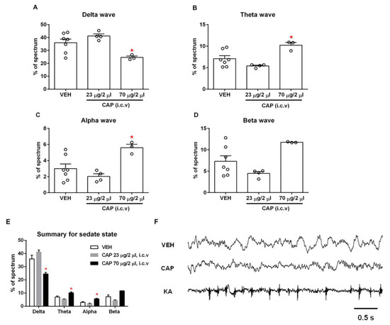 A delta wave is a high-amplitude brain wave that is defined as having a frequency range of 0.5–4 Hz. It is correlated with the deep sleep stage 3 of NREM sleep. Delta waves have been associated with various neurological disease such as Alzheimer’s disease, epilepsy and schizophrenia [16,17,18]. We observed a significant decrease in the proportion of delta waves in the high-dose capsaicin (70 μg/2 μL)-treated rats compared to vehicle-treated rats (capsaicin, 24.6 ± 1.1%; vehicle, 35.9 ± 2.9%; n = 3–7; p < 0.05), indicating that TRPV1 activation by capsaicin can affect the deep sleep stage 3 of NREM sleep (Figure 3A). Interestingly, both the theta (4–7.5 Hz) and alpha waves (8–11 Hz) increased significantly after the administration of high-dose capsaicin (theta: 10.2 ± 0.6%; alpha: 5.6 ± 0.4%) compared to the control group injected with vehicle only (theta: 7.1 ± 0.7%; alpha: 3.0 ± 0.6%; n = 3–7; p < 0.05; Figure 3B,C). Similarly, the proportion of beta waves (15–32 Hz) also exhibited an increase upon high-dose capsaicin injection (capsaicin, 11.7 ± 0.1%; vehicle, 7.3 ± 1.3%; n = 3–7; p > 0.05), though the change did not reach statistical significance (Figure 3D). In summary, the injection of high-dose capsaicin could substantially affect EEGs in the sleep stage, though individual waves responded differently.