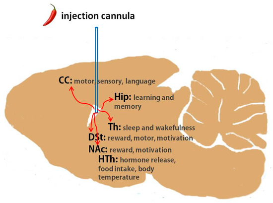 Rat brain diagram illustrating the location of capsaicin injection in relation to the cerebral cortex, hippocampus, dorsal striatum, nucleus accumbens, thalamus and hypothalamus. CC: cerebral cortex, Hip: hippocampus, DSt: dorsal striatum, NAc: nucleus accumbens, Th: thalamus, HTh: hypothalamus.